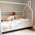 Das von Skandi Hausbett angebotene Bett hat einen traditionellen Rahmen, der mit zusätzlichen Brettern ausgestattet ist, die ein effektvolles Häuschen mit Dach und Schornstein bilden. Das Bett ist ideal, um einen Haushalt zu spielen, aber auch für viele andere Kinderspiele geeignet.